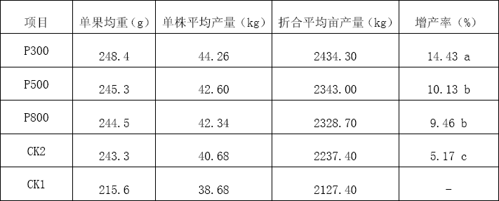 P300 倍 比 CK1 增 產(chǎn) 14.43%, P500 增 產(chǎn) 10.13%, P800 增 產(chǎn) 9.46%;“ 新 壯 態(tài) ” 與 CK2 相 比 P300 臍 橙 產(chǎn) 量 增 長 9.26 個(gè) 百 分 點(diǎn) , P500 增 長 4.96 個(gè) 百 分 點(diǎn) , P800 增 長 4.29 個(gè) 百 分 點(diǎn) 。